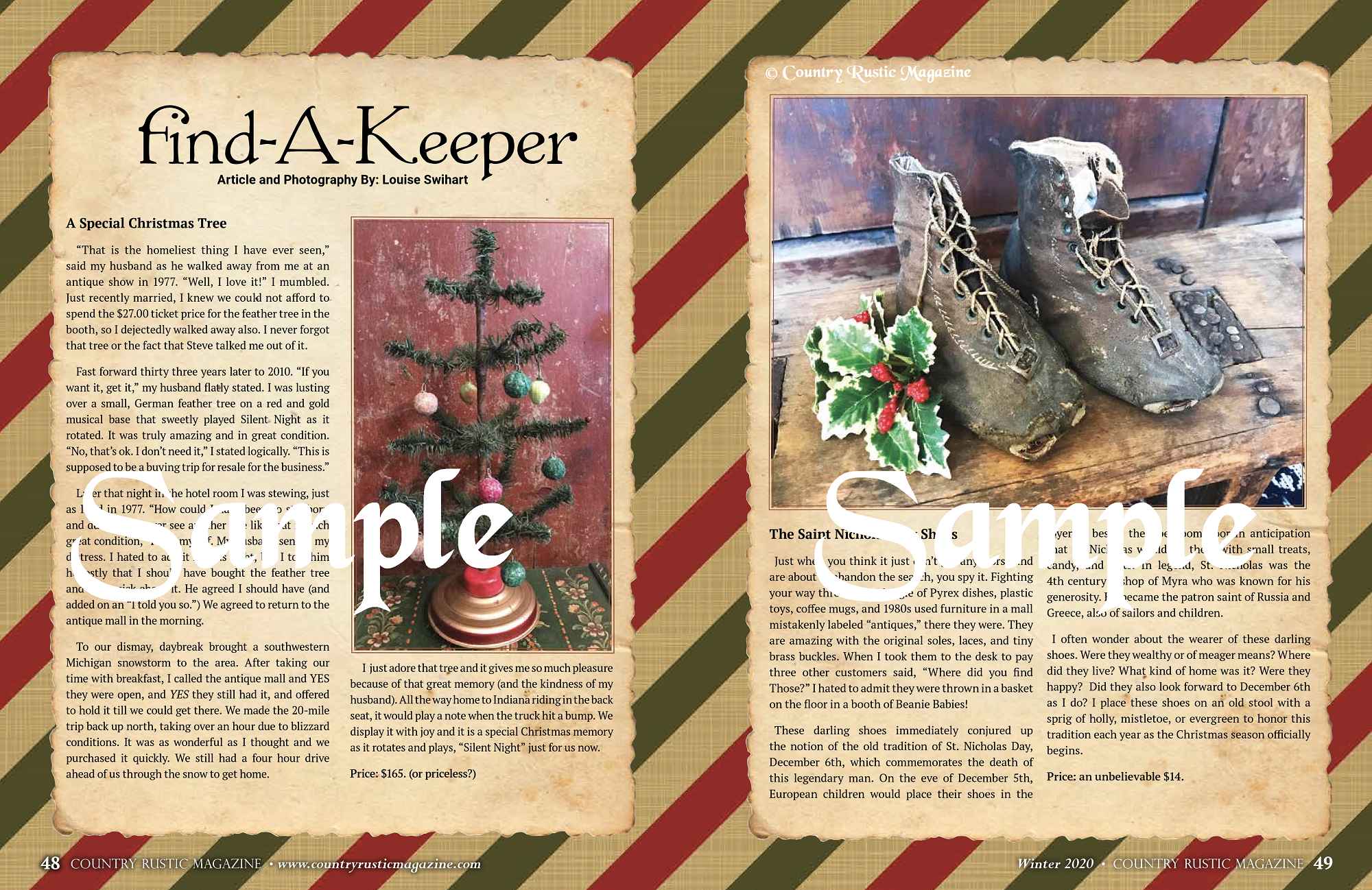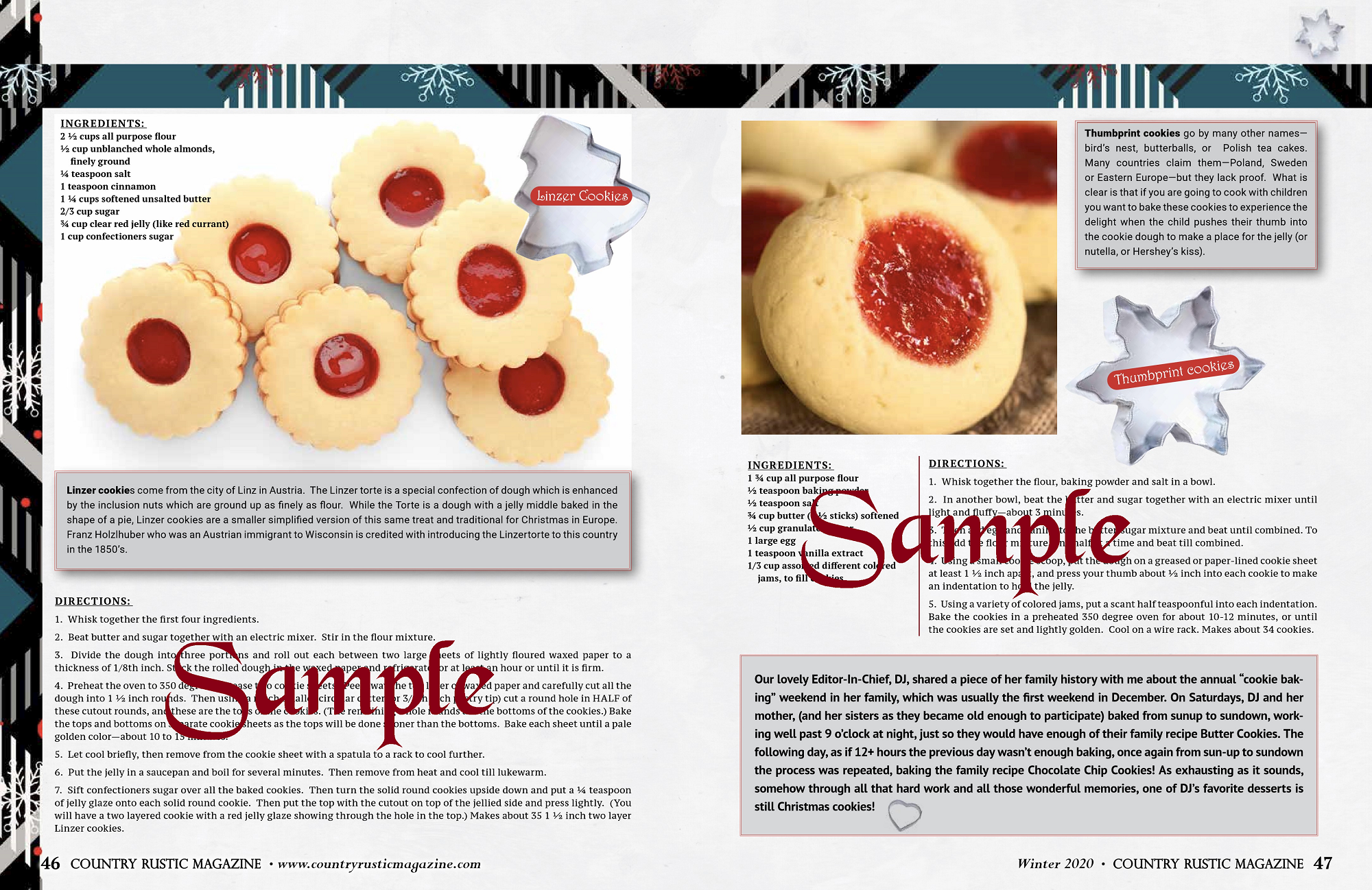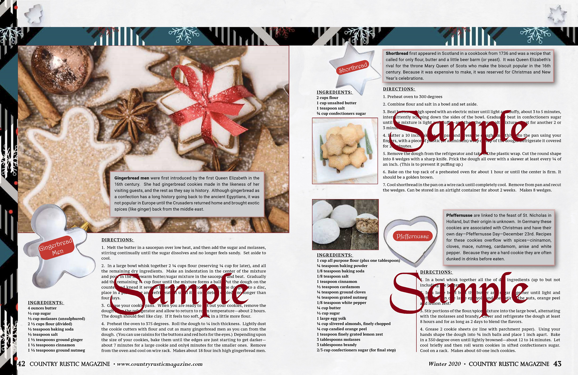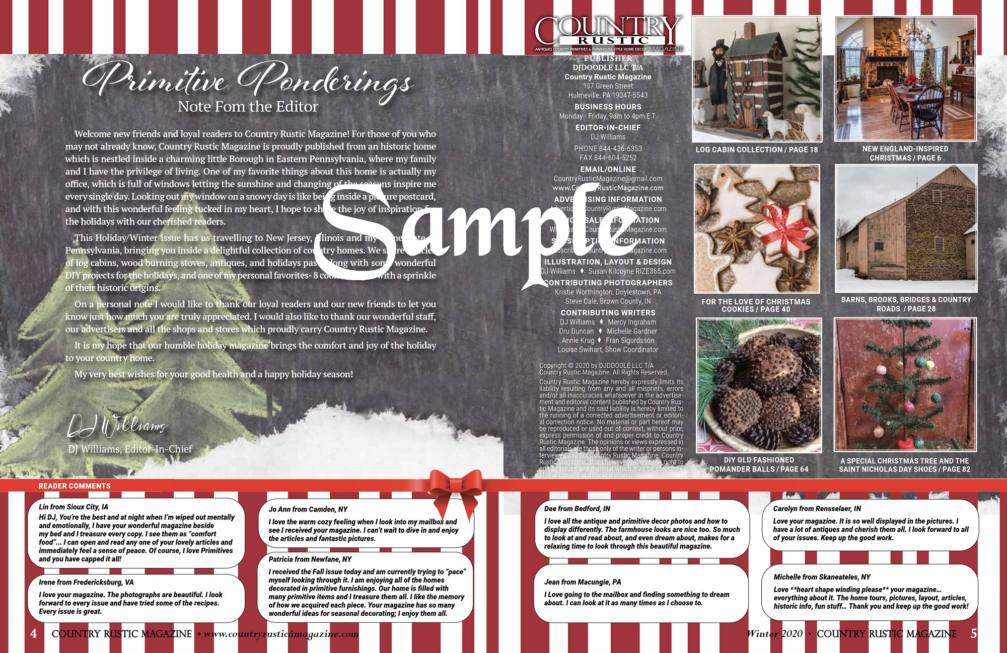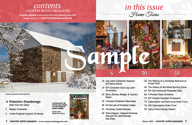 This Holiday/Winter Issue has us travelling to New Jersey, Illinois and my home state of Pennsylvania, bringing you inside a delightful collection of country primitive homes. In addition to our home tours, we share articles of log cabins, wood burning stoves, antiques, and holidays past, along with some wonderful DIY projects for the holidays, and one of my personal favorites- 8 cookie recipes with a sprinkle of their historic origins.